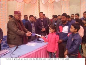 माननीय मंत्री ने आपदा प्रभावित परिवारों के पुनर्वास कार्य में तेजी हेतु सम्बन्धित अधिकारियों को दिशा-निर्देश दिए। कहा कि बौंठा मेें प्रभावित परिवारों के पुनर्वास हेतु चयनित की गई भूमि को समतलीकरण करें। इस दौरान माननीय मंत्री ने सरखेत में आई आपदा के दौरान लापता हुए व्यक्तियों के परिजनों को सहायता राशि वितरित की जिनमें लापता जगमोहन बिष्ट की पत्नी श्रीमती सपना देवी को 4 लाख रूपये की धनराशि तथा लापता राजेन्द्र सिंह के पुत्र आदित्य, अंशुमान एवं पुत्री आरूषी को 133334/- (प्रत्येक) को कुल 400000 धनराशि का चैक वितरित किए गए।