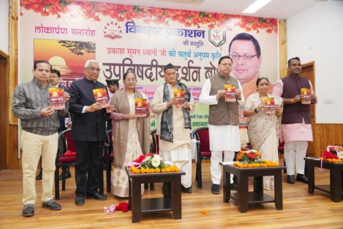 देहरादून। मुख्यमंत्री पुष्कर सिंह धामी ने बुधवार को मुख्यमंत्री कैम्प कार्यालय स्थित मुख्य सेवक सदन में प्रकाश सुमन ध्यानी द्वारा लिखित पुस्तक ‘उपनिषदीय दर्शन बोध’ का विमोचन किया। पुस्तक विमोचन के अवसर पर विधानसभा अध्यक्ष ऋतु खण्डूरी भूषण एवं महाराष्ट्र के पूर्व राज्यपाल और उत्तराखण्ड के पूर्व मुख्यमंत्री भगत सिंह कोश्यारी उपस्थित थे। मुख्यमंत्री ने ‘उपनिषदीय दर्शन बोध’ पुस्तक के लेखक प्रकाश सुमन ध्यानी को शुभकामनाएं देते हुए कहा कि वे भारतीय वैदिक दर्शन और सनातन संस्कृति के संवाहक के रूप में एक नई पहचान स्थापित कर रहे हैं। इस पुस्तक के माध्यम से उन्होंने उपनिषद के जटिल और गूढ़ रहस्यों को साधारण तरीके से लिखा है। भारतीय ज्ञान परंपरा के विभिन्न आयामों को सबके समक्ष रखा है। उपनिषद भारतीय संस्कृति और दर्शन की अमूल्य निधि है, जिसने संपूर्ण विश्व को ज्ञान और चेतना का मार्ग दिखाया है। हमारी ज्ञान परंपरा संपूर्ण विश्व को वसुधैव कुटुम्बकम के रूप में मानती है। उपनिषद आध्यात्मिक चिंतन के स्रोत के साथ ही मानवता को व्यावहारिक जीवन दृष्टि भी प्रदान करते हैं।