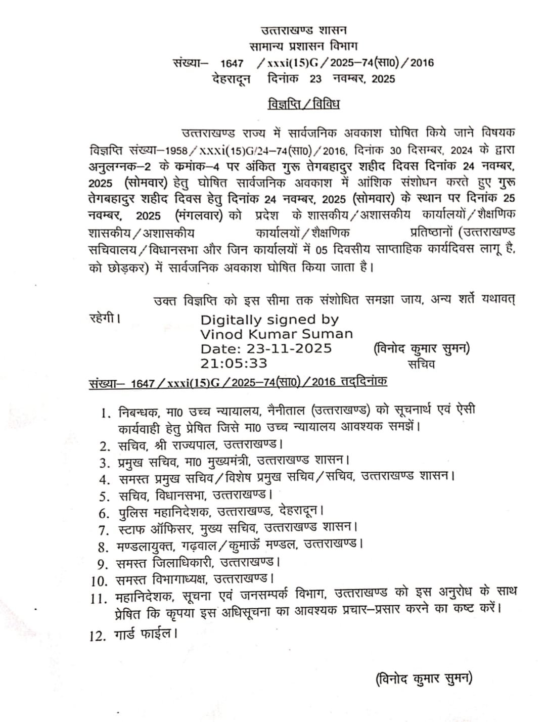 देहरादून। राज्य सरकार ने गुरु तेग बहादुर जी के शहीद दिवस के अवसर पर प्रदेशभर में सार्वजनिक अवकाश घोषित किया है। पहले यह अवकाश 24 नवंबर 2025, सोमवार को निर्धारित था, लेकिन शासन ने आदेश में बदलाव करते हुए इसे अब 25 नवंबर 2025, मंगलवार के दिन लागू करने का निर्णय लिया है।