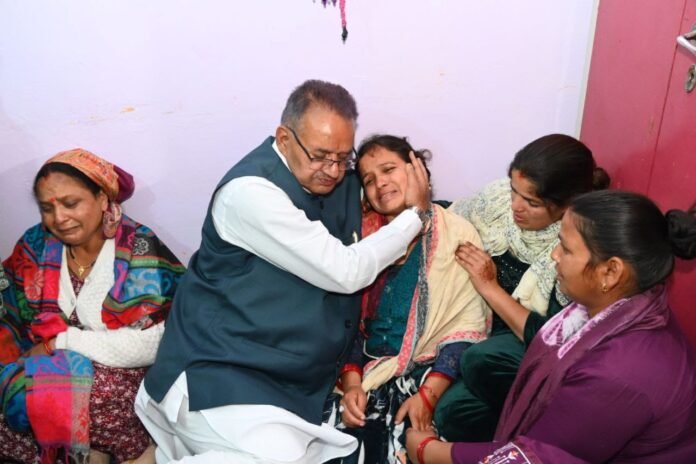 देहरादून। कैबिनेट मंत्री गणेश जोशी आज मालदेवता क्षेत्र पहुंचे, जहां बीती देर रात्रि रायपुर क्षेत्र के अंतर्गत शेरकी गांव में डंपर की चपेट में आने से 17 वर्षीय युवक की दर्दनाक मृत्यु हो गई थी। कैबिनेट मंत्री गणेश जोशी ने शोक संतप्त परिवार से मुलाकात कर गहरी संवेदना व्यक्त की। इस दौरान उन्होंने परिजनों को ढांढस बंधाते हुए कहा कि यह घटना अत्यंत दुखद और पीड़ादायक है। उन्होंने दिवंगत युवक की आत्मा की शांति के लिए प्रार्थना करते हुए ईश्वर से शोकाकुल परिवार को इस असहनीय दुःख को सहने की शक्ति प्रदान करने की कामना की।काबीना मंत्री जोशी ने जिलाधिकारी टिहरी और वरिष्ठ पुलिस अधीक्षक देहरादून से दूरभाष के माध्यम से वार्ता कर ऐसी घटना होने के कारण पर अंकुश लगाने और भविष्य में इस प्रकार की घटना की पुनरावृत्ति न हो। इस बाबत कैबिनेट मंत्री गणेश जोशी ने अधिकारियों को आवश्यक दिशा निर्देश दिए। उन्होंने कहा कि राज्य सरकार पीड़ित परिवार के साथ खड़ी है और सरकार की ओर से हर संभव सहायता प्रदान की जाएगी।