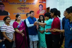 देहरादून। मुख्यमंत्री पुष्कर धामी ने कहा कि नारी शक्ति अपने कार्यों और आत्मविश्वास के बल पर तेजी से आत्मनिर्भर बन रही हैं। उन्होंने कहा कि आज हर क्षेत्र में महिलाओं का प्रतिनिधित्व बढ़ रहा है। मुख्यमंत्री आवास स्थित मुख्य सेवक सदन में सोमवार को आयोजित रक्षाबंधन समारोह में मुख्यमंत्री ने महिलाओं को रक्षा बंधन की शुभकामनाएं देते हुए कहा कि यह त्यौहार भाई- बहन के पवित्र बंधन का प्रतीक है। उन्होंने कहा कि रक्षाबंधन महिलाओं के सम्मान के साथ ही पौराणिक एवं सांस्कृतिक महत्व का भी पर्व है। इस दौरान मुख्यमंत्री ने कहा कि आज महिलाएं हर क्षेत्र में तेजी से आगे बढ़ रही हैं। राज्य में महिला स्वयं सहायता समूहों द्वारा सराहनीय कार्य किया जा रहा है। उन्हें आर्थिक रूप से मजबूत बनाने के लिए महिला स्वयं सहायता समूहों को पांच लाख रुपए तक का ब्याज मुक्त ऋण दिया जा रहा है। राज्य में महिला सशक्त बहना उत्सव योजना शुरू की गई है। महिलाओं को 30 प्रतिशत क्षैतिज आरक्षण दिया जा रहा है। धामी ने कहा कि प्रधानमंत्री नरेंद्र मोदी के नेतृत्व में महिला सशक्तिकरण के लिए अनेक कदम उठाए जा रहे हैं। कार्यक्रम में गीता पुष्कर धामी, भारतीय जनता पार्टी महिला मोर्चा की प्रदेश अध्यक्ष आशा नौटियाल, भाजपा महिला मोर्चा की राष्ट्रीय महामंत्री दीप्ति रावत, युवा मोर्चा की राष्ट्रीय उपाध्यक्ष नेहा जोशी, बाल आयोग की अध्यक्ष डॉ. गीता खन्ना, गीता रावत, रूचि भट्ट, नेहा शर्मा, आशा कोठारी आदि मौजूद रहे।