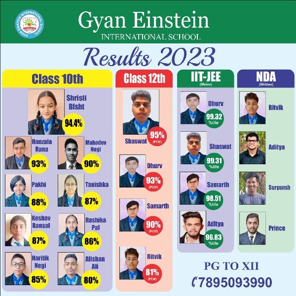 देहरादून। देहरादून प्रबल रामगढ़ शिमला रोड स्थित पलवल शीशम बाड़ा गांव में ज्ञान आइंस्टीन इंटरनेशनल स्कूल ने वर्ष 2022 23 के शिक्षा सत्र में कक्षा 10 के एवं कक्षा 12 के विद्यार्थियों का परिणाम शत प्रतिशत रहा विद्यालय की ओर से दिए गए परीक्षा बोर्ड में छात्र-छात्राओं ने जबरदस्त प्रदर्शन करते हुए विद्यालय व क्षेत्र का शिक्षा के क्षेत्र में नाम रोशन किया दसवीं कक्षा वह कक्षा 12 में बच्चों ने रिकॉर्ड अंकों के साथ विद्यालय में अपने परिवार का नाम रोशन किया है सभी सफल छात्र-छात्राओं के शानदार प्रदर्शन को देखते हुए बच्चों के अभिभावकों ने व क्षेत्रवासियों ने विद्यालय की शिक्षा व्यवस्था पर जमकर तारीफ की विद्यालय की कक्षा 10 में सृष्टि बिष्ट ने 94% अंजना राणा ने 93% पाखी ने 88% तनीषा ने 87% अंक प्राप्त कर विद्यालय का नाम रोशन किया तथा कक्षा 12 में शाश्वत ने 95% समर्थ नेगी ने 92 प्रतिशत ध्रुव ने 93% व रितिक ने 81% अंक प्राप्त कर विद्यालय का नाम रोशन किया विद्यालय के एम डी सेमवाल जी ने सभी बच्चों व विद्यालय की सभी अध्यापक अध्यापिका ओं को इस सफलता पर बधाई दी उन्होंने कहा की सफलता पर पूरी प्रबंधक कमेटी को अपने अध्यापक अद्यापिका व बच्चों पर गर्व है
